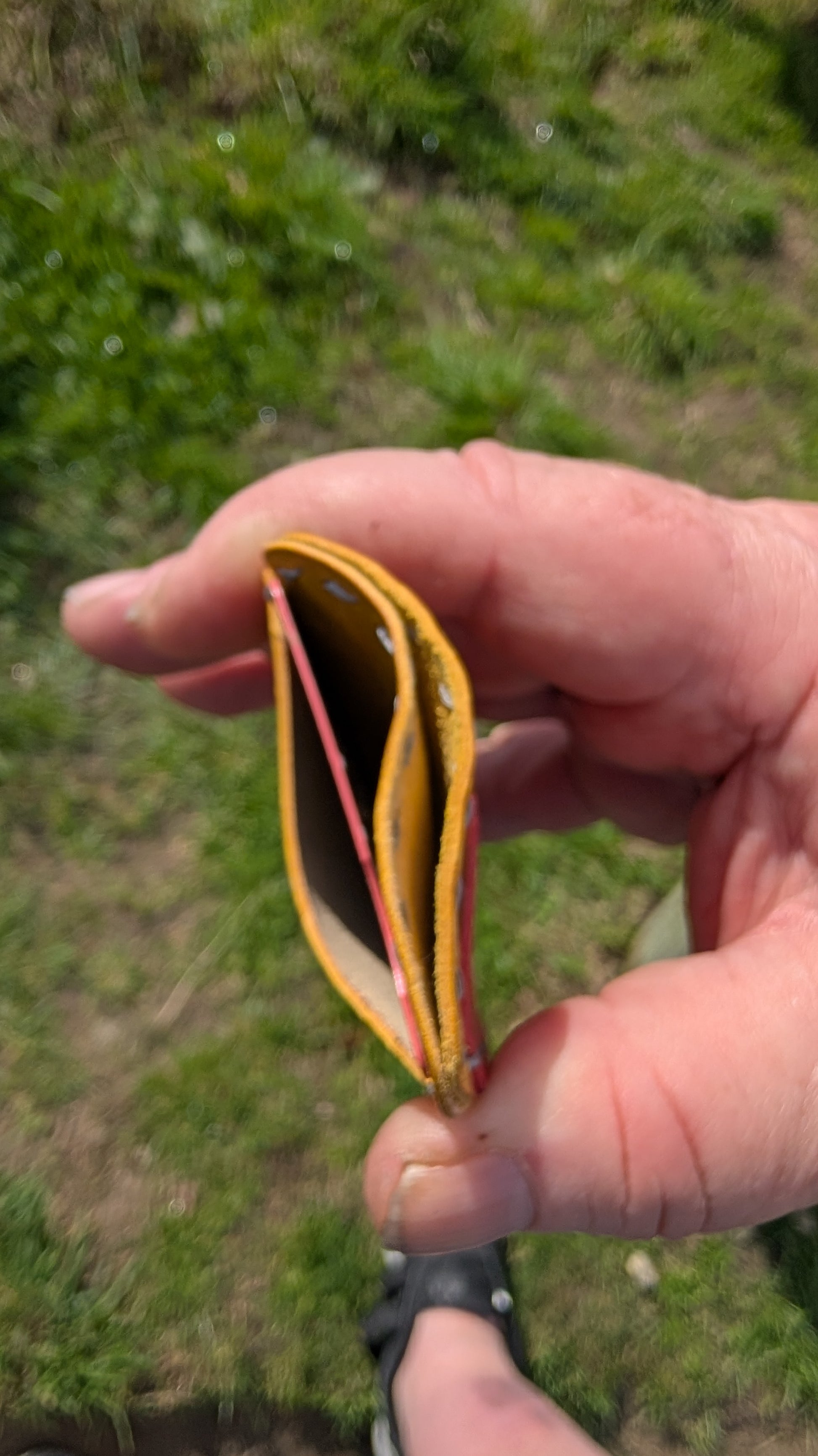 The Minimalist 2 Pocket Card Sleeve offers a sleek, compact solution for carrying essentials without bulk. Crafted from premium smooth Italian leather in a striking yellow and red colorway, it combines elegance with practicality. Designed with two carefully sized pockets, it securely holds cards and cash, making it perfect for occasions when carrying a full-sized wallet feels cumbersome. Its refined construction ensures durability while maintaining a slim profile that fits comfortably in pockets or small bags. For added versatility, there is also a festival version featuring an eyelet and leather thong necklace, ideal for secure hands-free carrying during events.